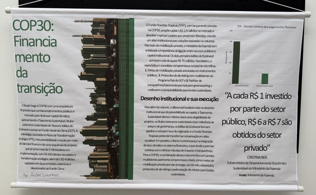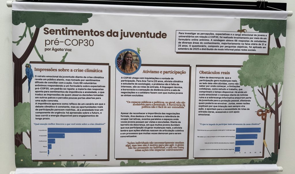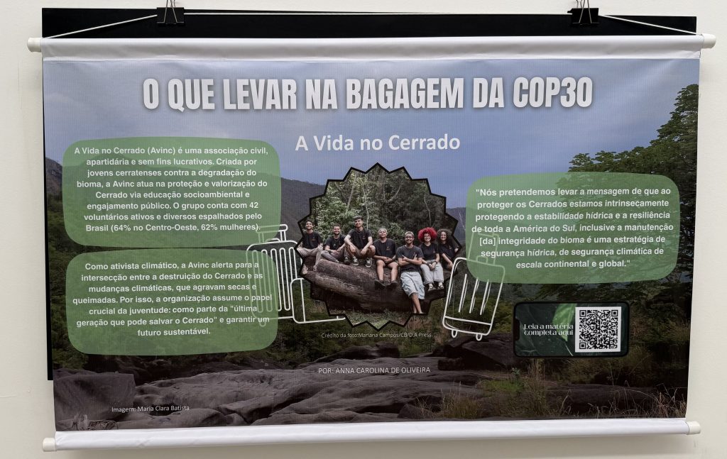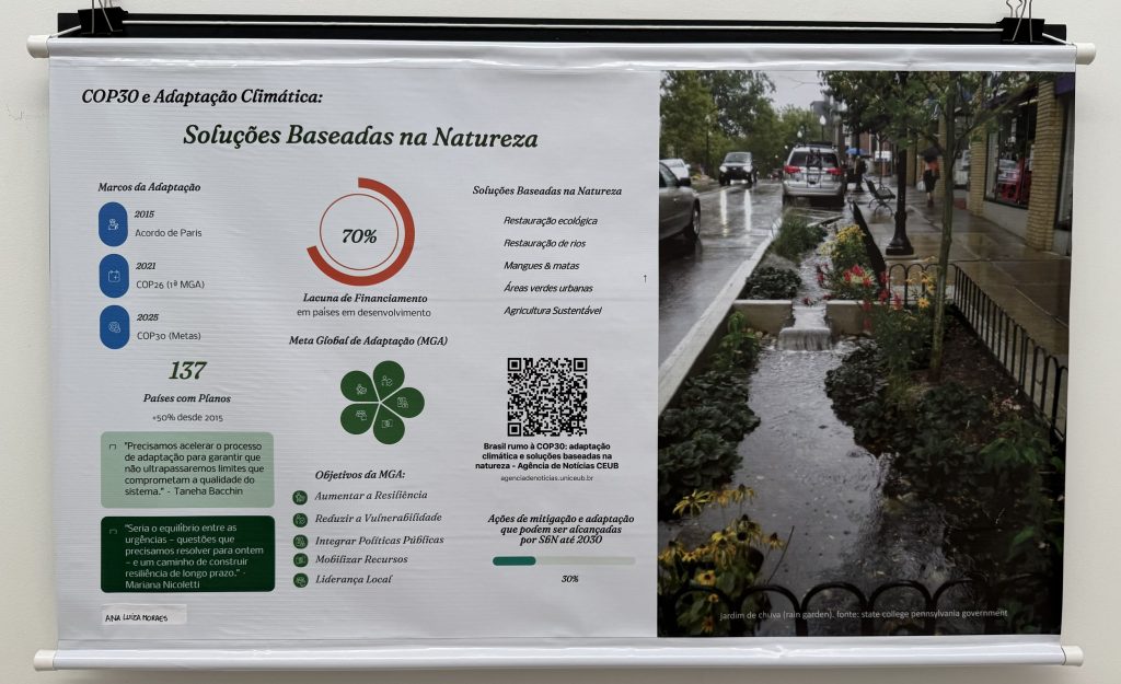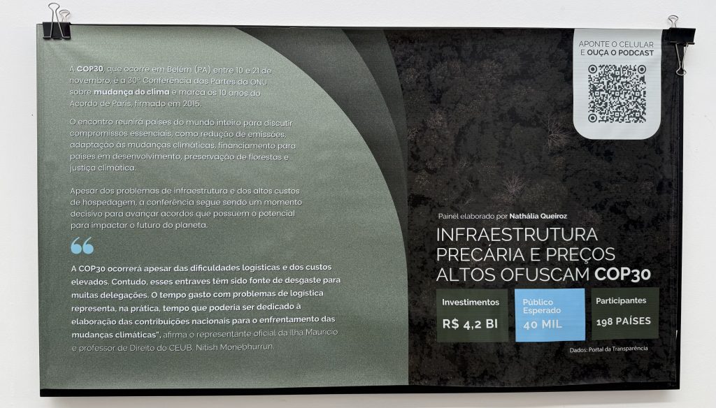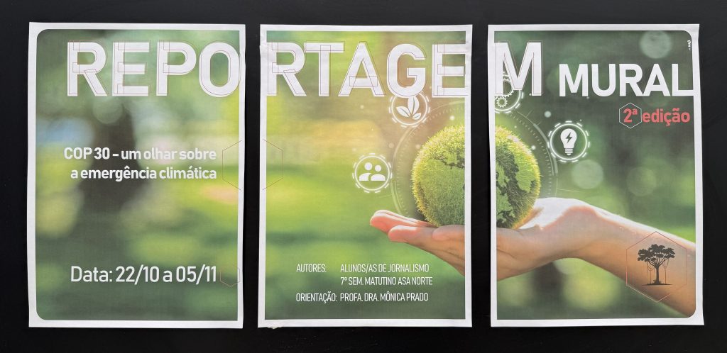 Este e outros conteúdos estiveram presentes na 2ª edição da “Reportagem Mural – COP 30: um olhar sobre a emergência climática”, que foi realizada pelos estudantes de jornalismo da disciplina de Jornalismo Científico e Ambiental entre os dias 29 de outubro e 05 de novembro, sob orientação da  professora Mônica Prado. Com o objetivo de tratar sobre temas fundamentais a serem discutidos da COP 30, as reportagens se debruçaram sobre diversos assuntos e trouxeram uma construção visual exposta no corredor do Bloco 12 do Centro Universitário de Brasília – CEUB.
