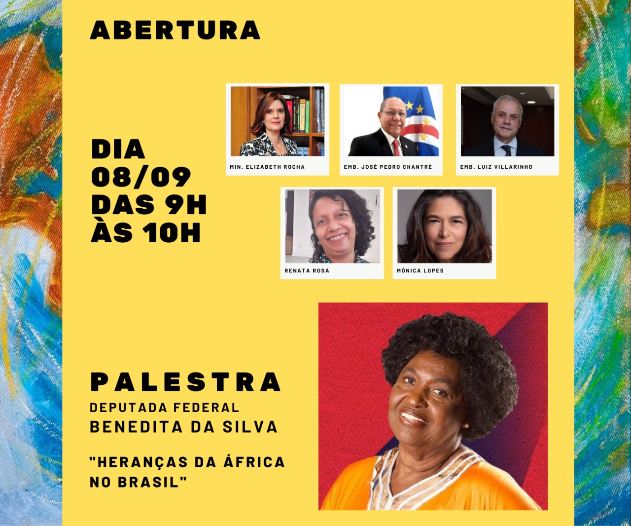 9h – Abertura • Mônica Lopes, do Centro de Inovação e Estudos Sociais do CEUB • Ministra Elizabeth Rocha, do Superior Tribunal Militar • Excelentíssimo Senhor José Pedro Máximo Chantrè, Embaixador da República de Cabo Verde no Brasil • Excelentíssimo Senhor Luiz Eduardo de Aguiar Villarinho Pedroso, Embaixador do Brasil na República Democrática Federal da Etiópia • Renata Rosa, Instituto Maria Quitéria 9h30 – Palestra da Deputada Federal Benedita da Silva.