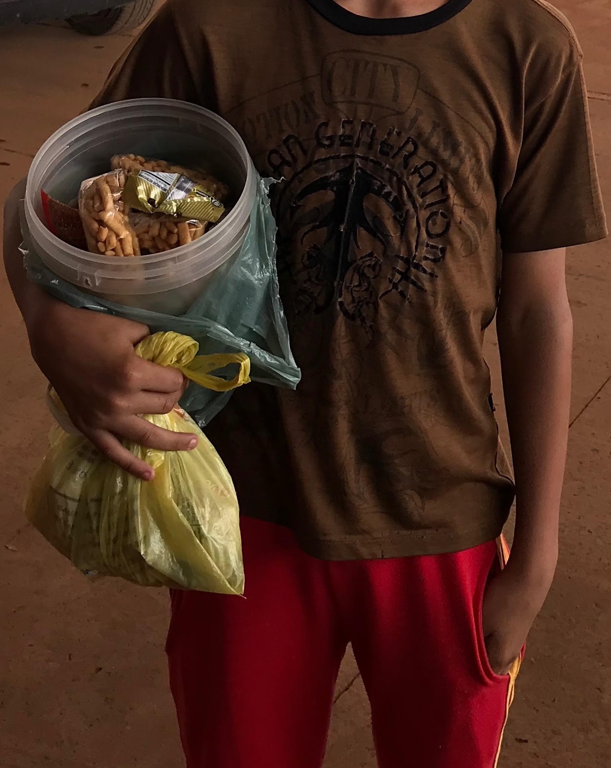 Moreno de olhos escuros, corpo franzino, boa lábia, e um balde branco cheio de amendoim e doces. Carlos Eduardo, 12 anos, mora no entorno do Distrito Federal, na cidade de Águas Lindas de Goiás e desde os nove anos de idade vende doces pelas ruas da cidade. O menino conta que parou de estudar no quinto ano do ensino fundamental. Todos os dias, Carlos Eduardo anda cerca de 2,5 quilômetros a pé pelo centro da cidade passando de escritório em escritório oferecendo guloseimas. “Eu prefiro vender meus doces e ter dinheiro do que estar na rua aprendendo coisas erradas”, declara o menino que quando consegue uma carona nos ônibus coletivos vai vender doces em Brasília.