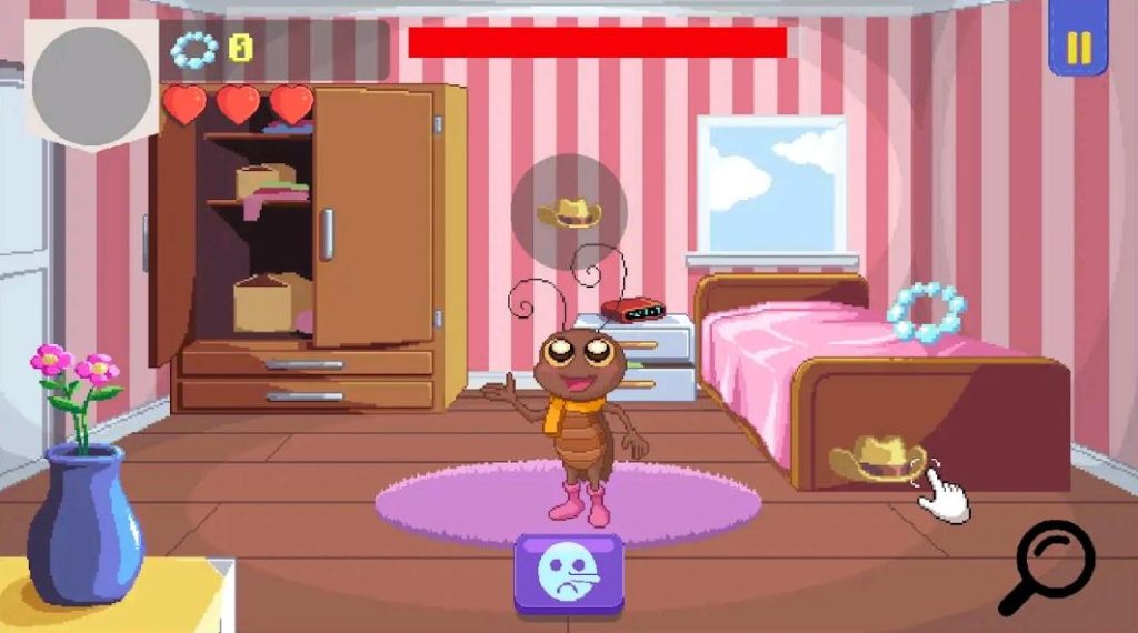 #ParaTodosVerem: Print do jogo Dona Aranha e Seus Amigos: Novas Aventuras, em estilo pixel art ambientado em um quarto infantil com paredes rosa listradas. No centro da cena, há uma barata de pé, de cor marrom, usando um cachecol laranja e botas rosas, sorrindo e fazendo um gesto com a mão. Acima de sua cabeça aparece um balão de pensamento com o desenho de um chapéu. À esquerda, há um guarda-roupa marrom aberto, exibindo caixas e roupas. No canto inferior esquerdo, um vaso azul com flores rosas está sobre uma mesa amarela. À direita, há uma cama rosa com uma pequena estante branca ao lado, onde está um rádio vermelho. No chão, próximo à cama, há a imagem de um chapéu em pixel art, e um cursor em formato de mão aponta para ele, indicando interação. No topo da tela, aparecem elementos típicos de interface de jogo: corações de vida, um contador e uma barra vermelha horizontal. No canto superior direito, há um botão de pausa.