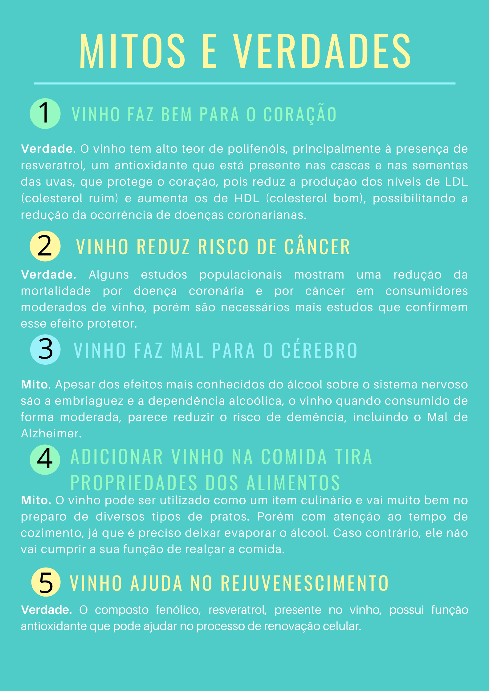 A nutricionista Alessandra Gaspar acredita que o vinho oferece muitos benefícios para o corpo, dentre eles o bom funcionamento do cérebro, auxílio dos aparelhos digestivo e respiratório, estimula a produção de insulina, atua como anti-infeccioso e imunoestimulante. Outro benefício é que ajuda a reduzir os riscos de câncer e retardar o envelhecimento.