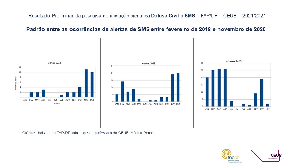 “Ao analisar e buscar padrões entre as ocorrências de alertas, conseguimos encontrar alguns que se repetiram nos três anos”, explica o bolsista da Fundação de Amparo à Pesquisa do DF (FAP-DF), Ítalo de Alencar, que desenvolve projeto de iniciação científica sob a orientação da professora Mônica Prado, no Centro Universitário de Brasília (CEUB).