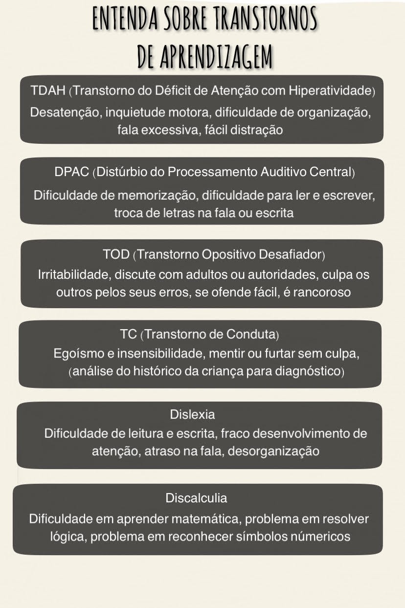 Conheça os transtornos atendidos pelos pedagogos entrevistados e algumas características. Eles aconselham a procura de um médico para o diagnóstico de fato.