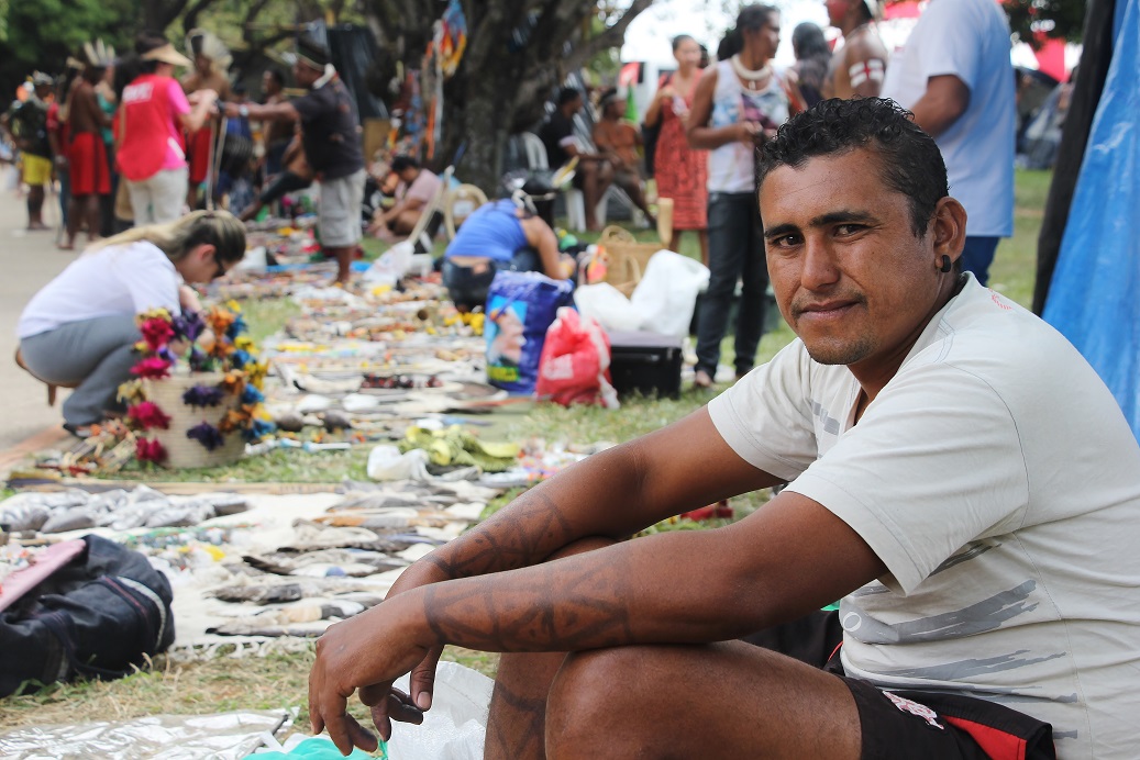 “Lá eu nasci, lá eu moro e é por isso que eu tô na luta”, conta com orgulho o artesão Márcio Simão Ferreira, 32, da reserva indígena Karapotó Plaki-ô, localizada em Alagoas.É a primeira vez que Márcio vem representar sua aldeia no Acampamento Terra Livre. Sentado embaixo de uma árvore, ele cuida dos artesanatos de amigos enquanto eles participam de uma dança, ritual de protesto, junto aos parentes de outras etnias do nordeste do Brasil. De acordo com eles, a dança é muito utilizada por povos indígenas da região de Alagoas para se manifestar em diversas ocasiões. Além do protesto, o momento é também de confraternização.
