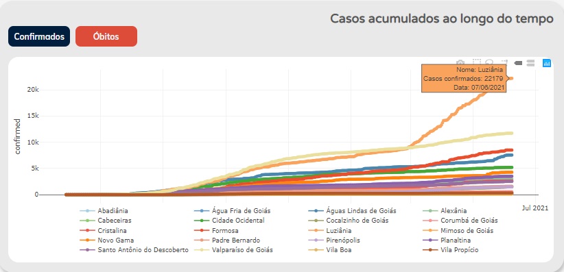 Os casos confirmados de covid-19 não param de crescer em Luziânia (GO) desde o dia 1º de março de 2021. São registrados 22 mil 184 casos confirmados até o dia 8 de junho, enquanto Valparaíso (GO) registra, até o mesmo dia, 11 mil 718 casos. Os 20 municípios do Entorno registram um total de 77 mil 862 casos, até o dia 8 de junho, e Luziânia representa 28,49% do total de casos em números absolutos.
