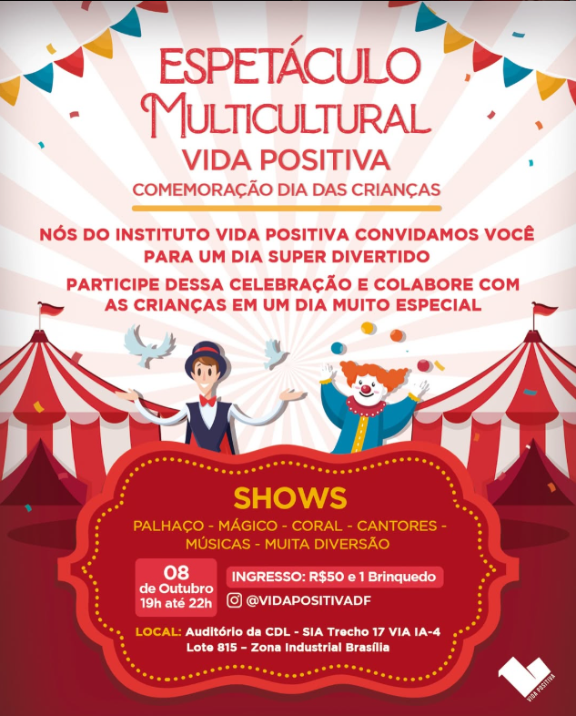 Nessa comemoração do Dia das Crianças, o Espetáculo Multicultural vai propor um ambiente de diversão. O evento, com temática de circo, contará com brincadeiras para as crianças conduzidas por um palhaço. Um mágico também tem presença confirmada, além de números musicais em conjunto com as 27 crianças e jovens assistidos pelo projeto.