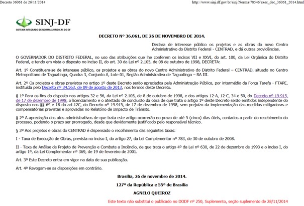 Em virtude dessa situação, Agnelo foi condenado em 2017 por improbidade administrativa pela inauguração do Centro Administrativo do Distrito Federal. De acordo com o Ministério Público do Distrito Federal e dos Territórios (MPDFT), em 2014, o ex-governador teria editado o Decreto nº 35.800/2014 para retirar a exigência do Laudo de Conformidade e do Relatório de Impacto de Trânsito (RIT), documentos necessários para a concessão do Habite-se. Diante da necessidade de apresentação desses documentos, Agnelo editou um novo decreto de nº 36.061/2014 (ver print de tela abaixo), o qual declarava o Centrad como obra de interesse social, com direito à dispensa de apresentação do Laudo de Conformidade para obtenção do Habite-se.
