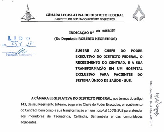 Em abril de 2017, o deputado distrital Robério Negreiros, na época ligado ao partido PSDB, através da Indicação N° 10267/2017, sugeriu o recebimento do Centrad e a transformação em um hospital do Sistema Único de Saúde (SUS) para atender os moradores de Taguatinga, Ceilândia, Samambaia e as comunidades adjacentes, mas nada foi feito.