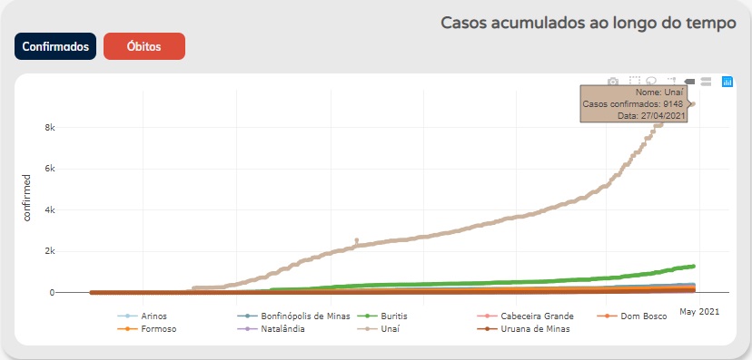 Unaí registrou o primeiro caso da doença no dia 30 de março de 2020. Após apresentar uma leve estabilidade, porém, desde janeiro de 2021, o número de casos vem aumentando, chegando a registrar 3.6% de crescimento diário acumulado no dia 2 de abril de 2021. Quanto ao número de óbitos, desde o dia 1 de fevereiro, eles não param de crescer, após um patamar levemente estável entre setembro de 2020 e janeiro de 2021. No período de 1 de fevereiro a 27 de abril de 2021, o número de óbitos por covid-19 cresceu 169%, considerando que no dia 1o de fevereiro eram 69 os óbitos registrados e no dia 27 de abril, 186 vidas foram perdidas.