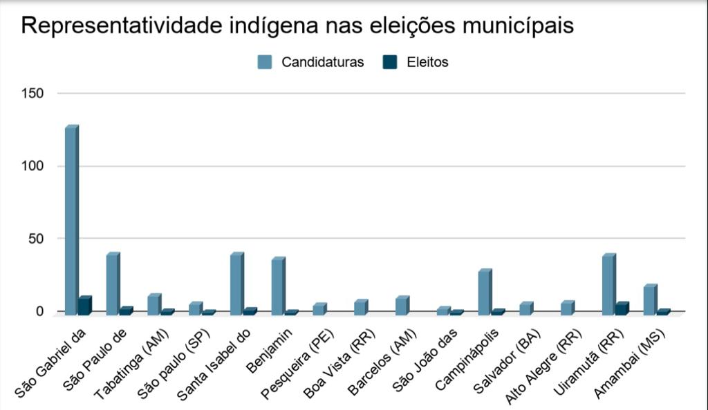 Entre as sete cidades com o maior número de indígenas, três elegeram prefeitos que se declararam com essa origem no último dia 15. Na cidade de São Gabriel da Cachoeira (AM), em que cerca de 76% de sua população é indígena, o prefeito eleito, Clovis Cubarão, ganhou com 50,36%. Já na cidade de São João das Missões (MG), em que cerca de 68% é indígena, o prefeito eleito, Jair Xakriabá, ganhou com 53,70%. Por último, a cidade de Uiramutã (RR), em que cerca de 88% da população é indígena, elegeu o prefeito Tuxaua Benisio, com 42,49%.