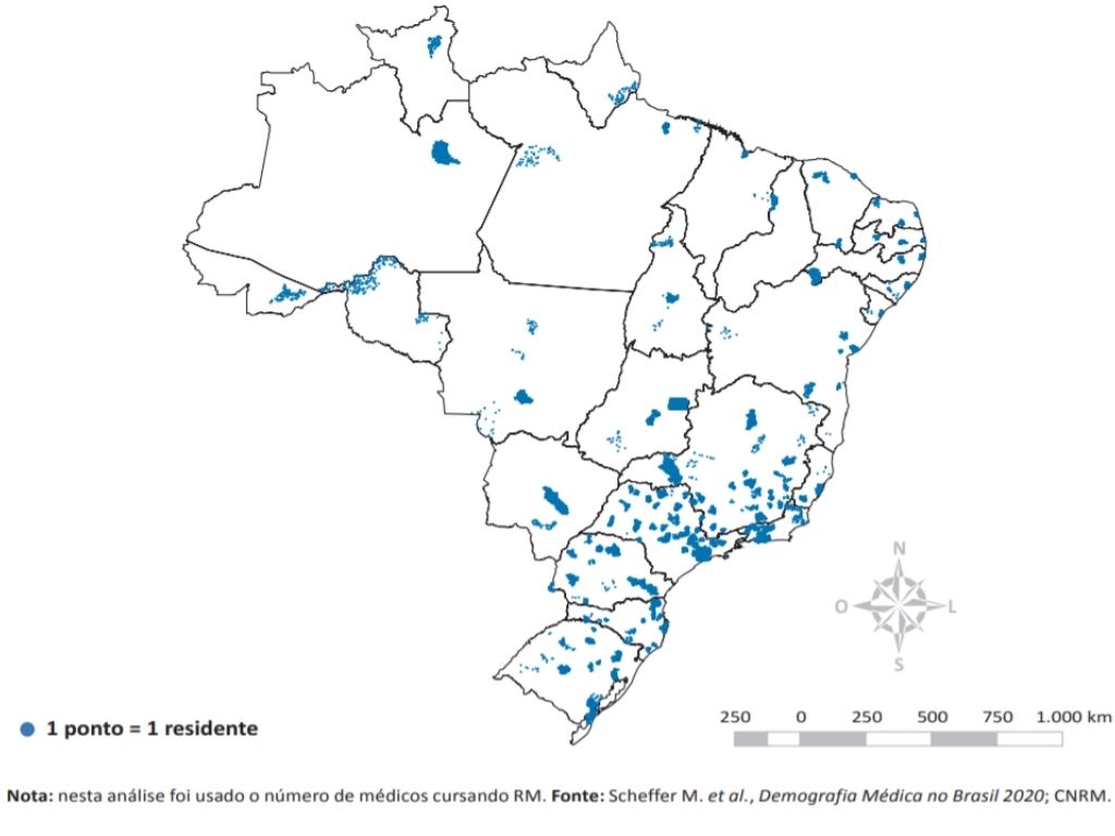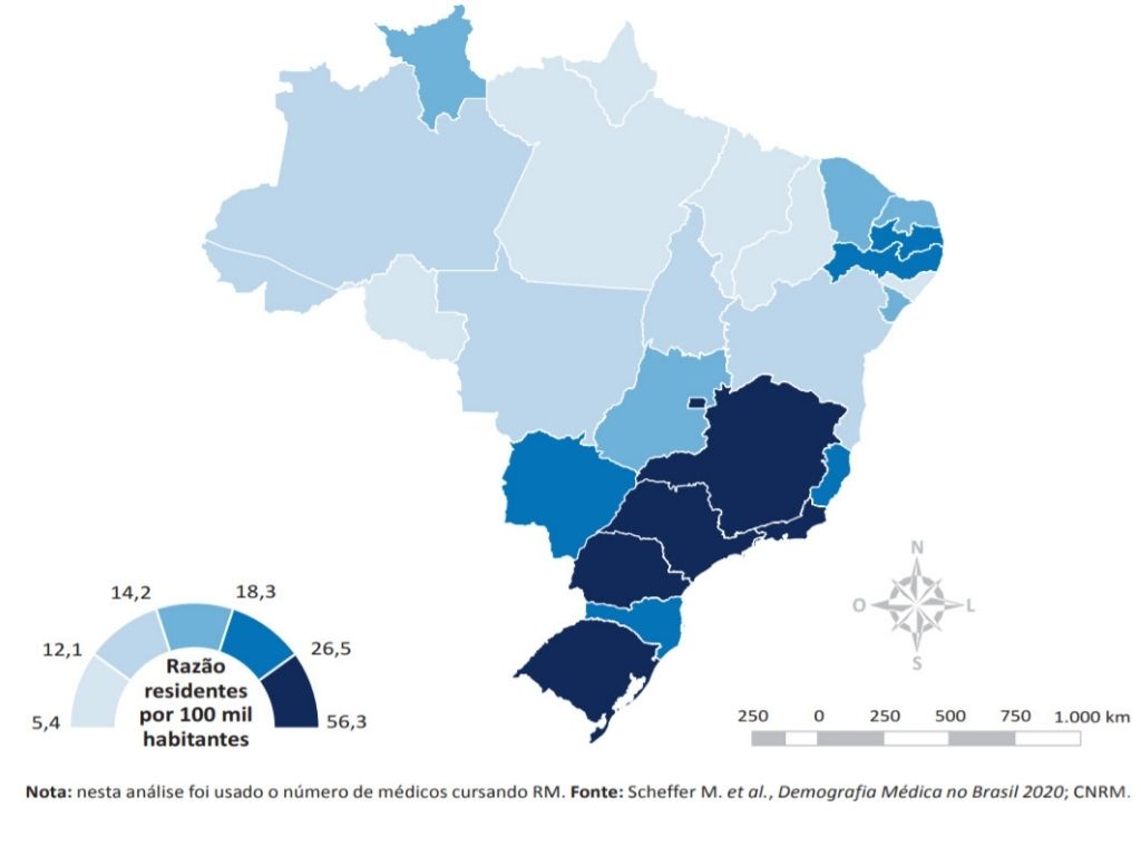 O número de residentes acompanha a desigualdade. Em 2019, a região Sudeste concentrou 57,3% dos médicos residentes e o Norte do país registrou apenas 3,7% do total. Enquanto São Paulo somou 33,9% dos residentes, outras 12 unidades federativas contaram com menos de 1%. Na comparação entre zona rural e zona urbana, a diferença é enorme: 97,5% dos médicos estavam em áreas urbanas.