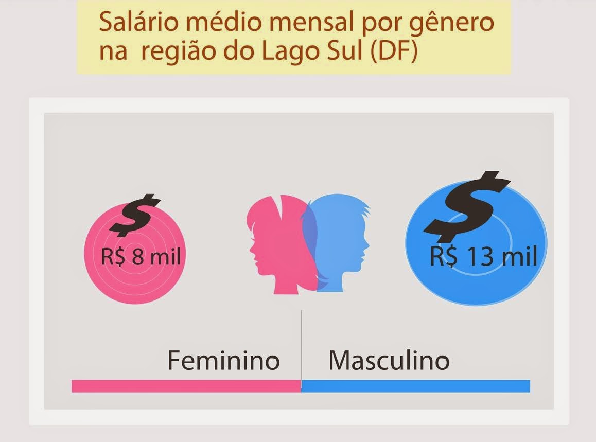 No Lago Sul, região administrativa, com maior índice de desenvolvimento humano (IDH) do Distrito Federal, também é possível constatar diferenças salariais entre homens (R$ 13 mil) e mulheres (R$ 8 mil), conforme pesquisa “As mulheres no Distrito Federal e nos municípios metropolitanos – Perfis da Desigualdade”, realizada pela Companhia de Planejamento do Distrito Federal (Codeplan). A pesquisa apontou dados que mostram que a disparidade de oportunidades é presente no campo profissional e domiciliar.A diferença salarial mostra uma desigualdade severa, tendo em vista que os homens chegam a receber 62% a mais. O sexo masculino também domina a responsabilidade residencial. Além disso, a pesquisa aponta que apenas 18% das casas da região são mantidas pelas mulheres.