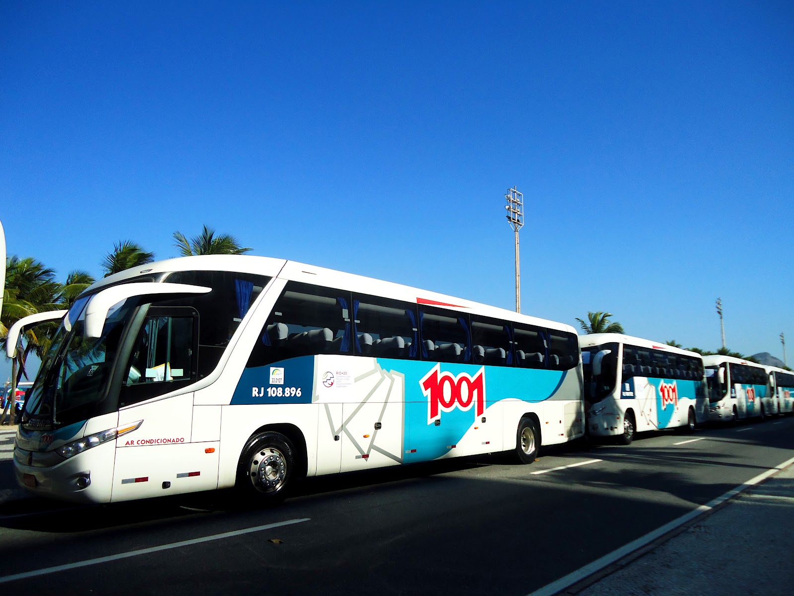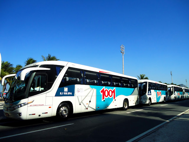 Todos os dias, até o fim da Rio +20, a vista da praia vai ficar tomada por 60 ônibus estacionados no final da Ave. Atlântica durante o intervalo entre o trajeto de ida e o trajeto de volta da orla de Copacabana para o Riocentro, local da Conferência. Os ônibus recolhem os delegados nos hotéis credenciados pela organização da Conferência, sendo cinco deles na orla de Copacabana e três na orla de Ipanema. Entre 7 e meia da manhã e 11 da noite, os ônibus da empresa JW Transporte e os seus motoristas buscam e levam os delegados. Os funcionários, todos de camiseta verde com logo de reciclagem nas costas, ficam no calçadão organizando esse leve e trás. “Os ônibus param nos hotéis que são pontos de referência e os delegados, mesmos os que estão hospedados em outros lugares, devem tomar o ônibus no hotel credenciado”, explica o funcionário da empresa, Mario Coutinho.